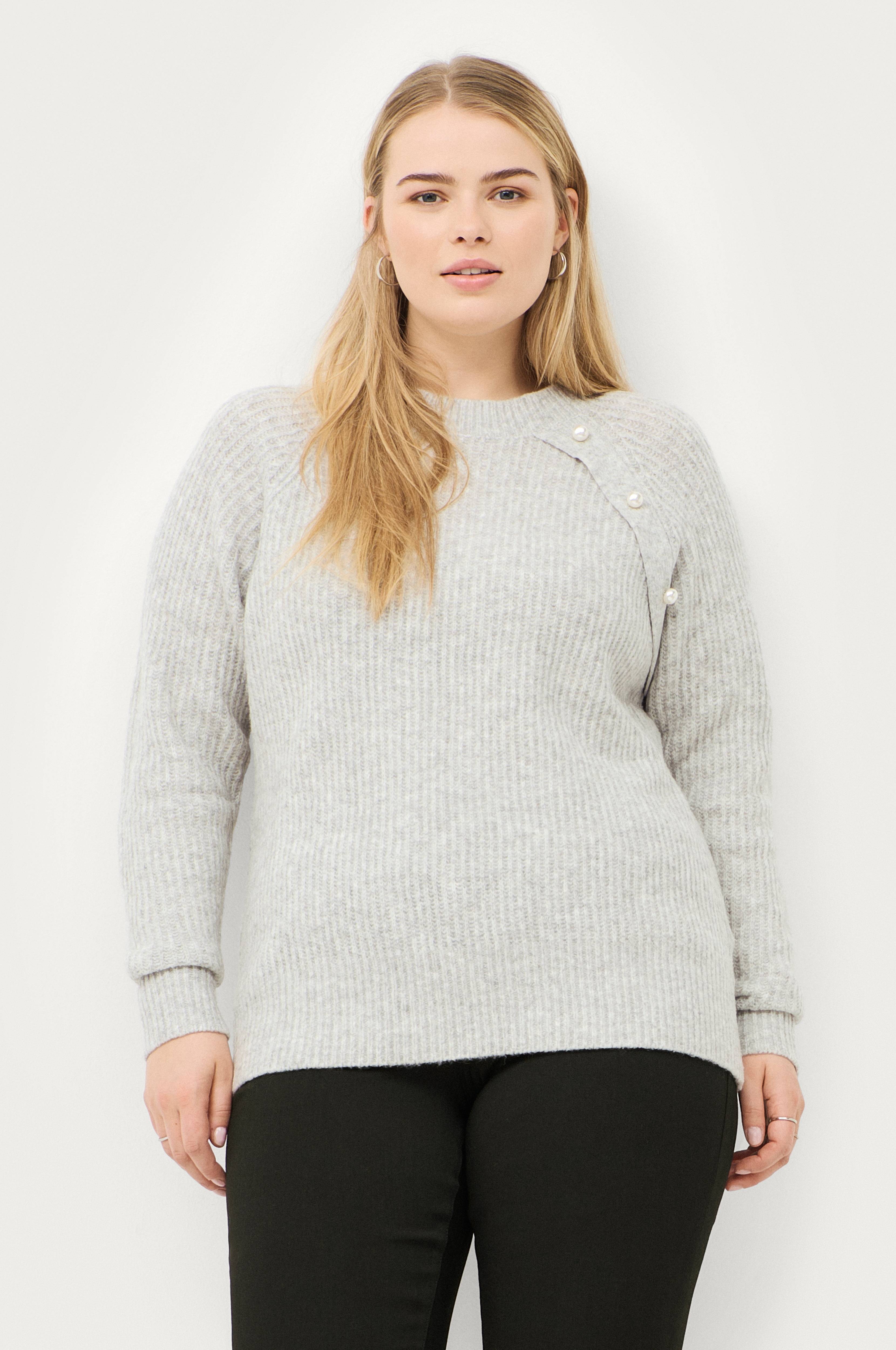 • Plusstørrelser• Myk, ribbestrikket kvalitet• Dekorative perler ved skulderen• Raglanermer