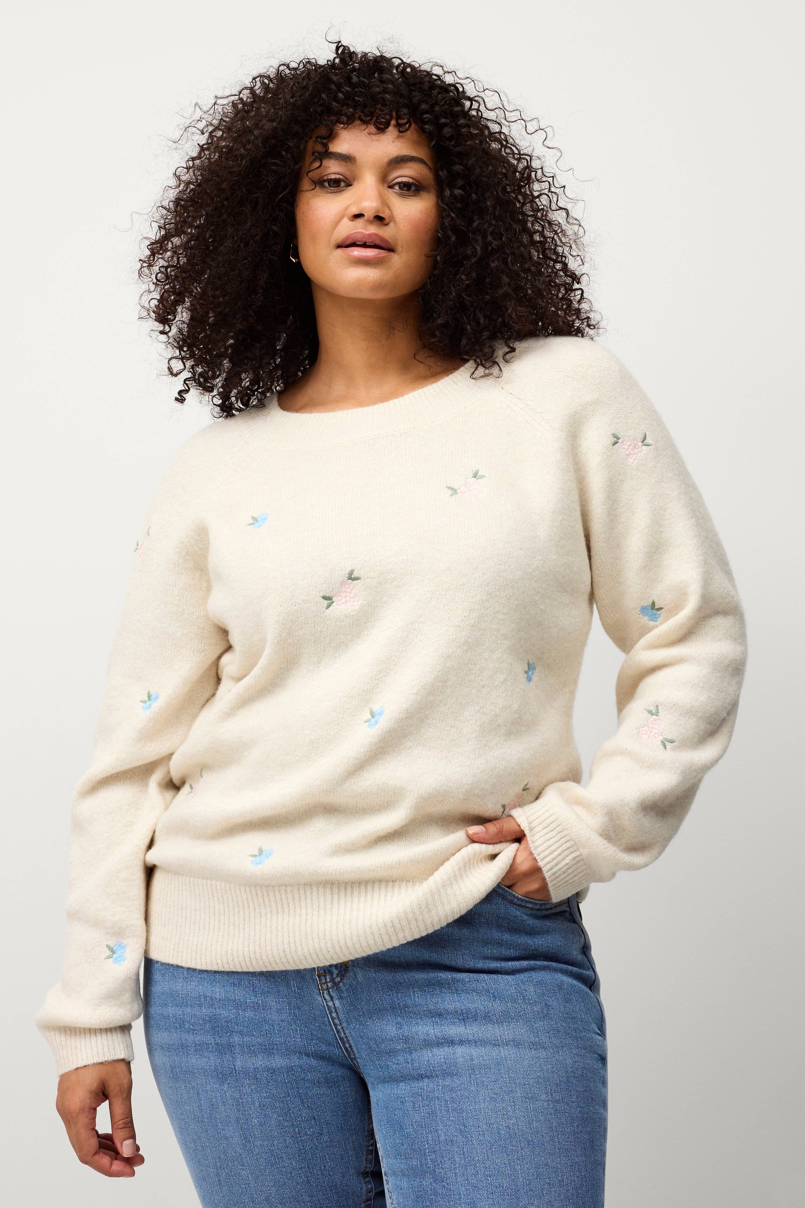 • Myk, strikket kvalitet• Broderte blomster• Ribbestrikket hals• Raglanermer• Plusstørrelser
