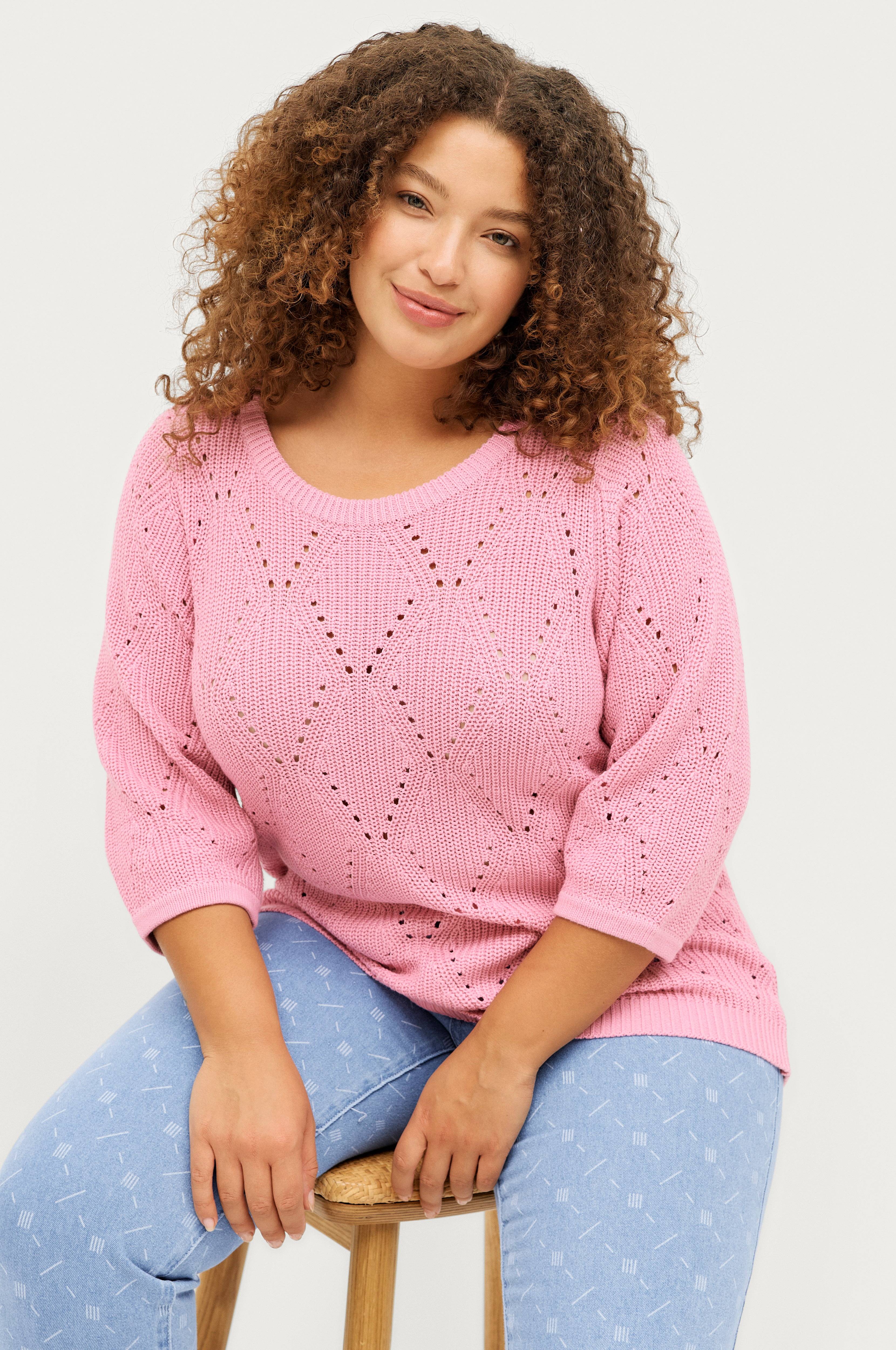 • Strikket genser i bomullsblanding med hullmønster rundt• Rund halsringning• Nøkkelhulsåpning bakpå med perleknapp• Armer 3/4 lang• Plusstørrelser