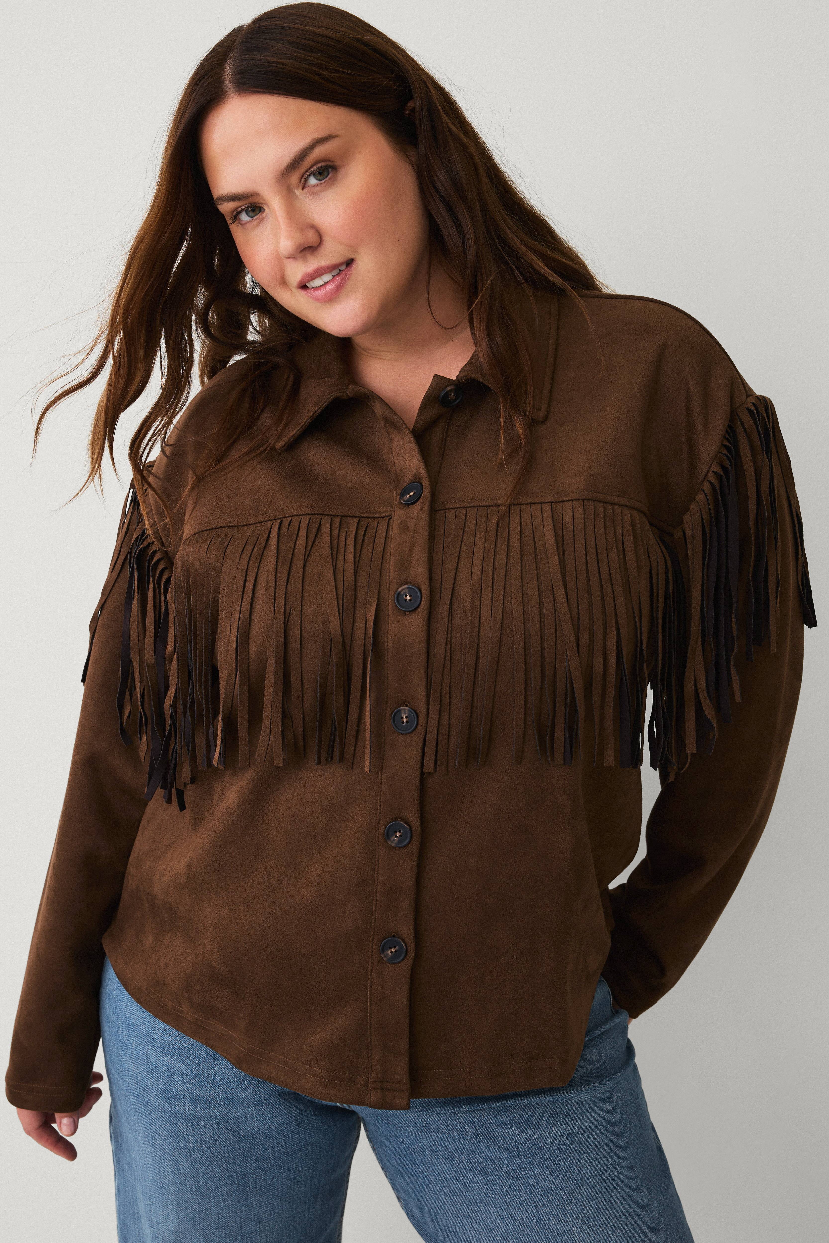 • Jakke i semsket skinnimitasjon med frynsedetaljer
