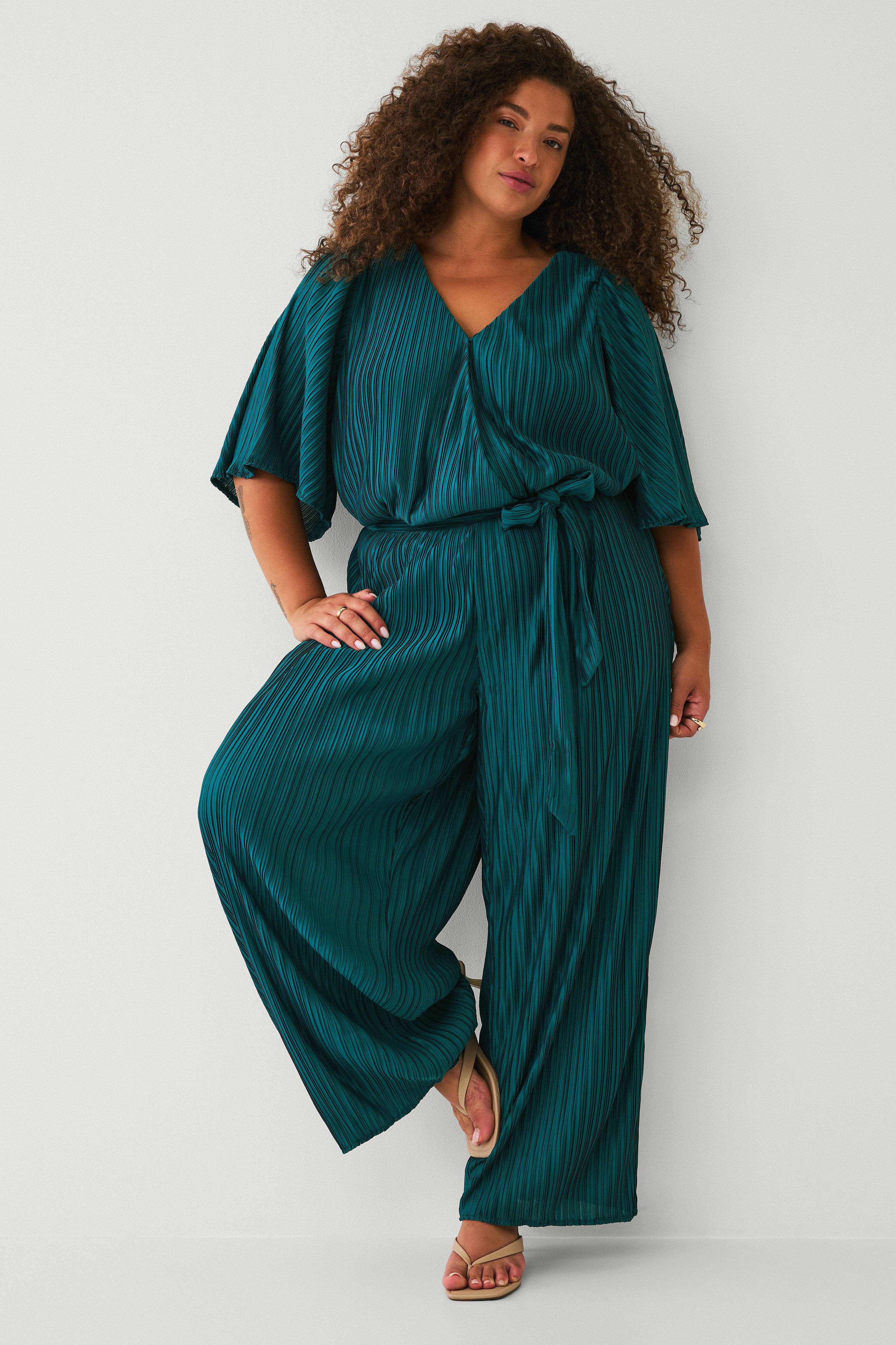• Plissert jumpsuit med halvlange, utsvingte ermer• V-hals snitt med omslagsdesign og en skjult knapp• Elastisk midje med knytbar tråd• Foring i jersey• Plusstørrelse• Lengde: 153 cm i størrelse S