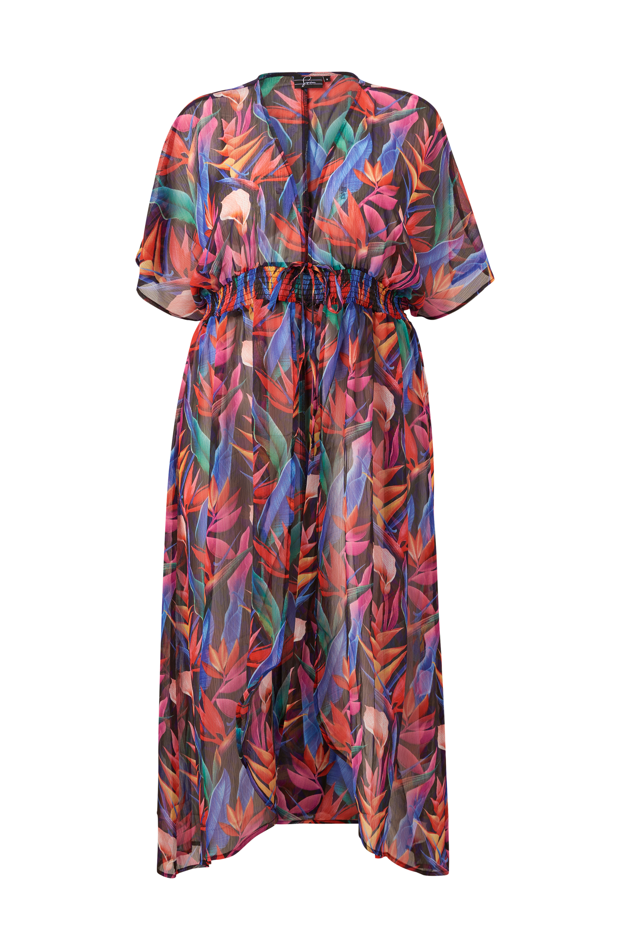 • Lang strandkjole med knytbar tråd foran• Vaffelsøm ved midjen• Korte kimonoermer• Laget av gjennomsiktig chiffon• Plusstørrelser
