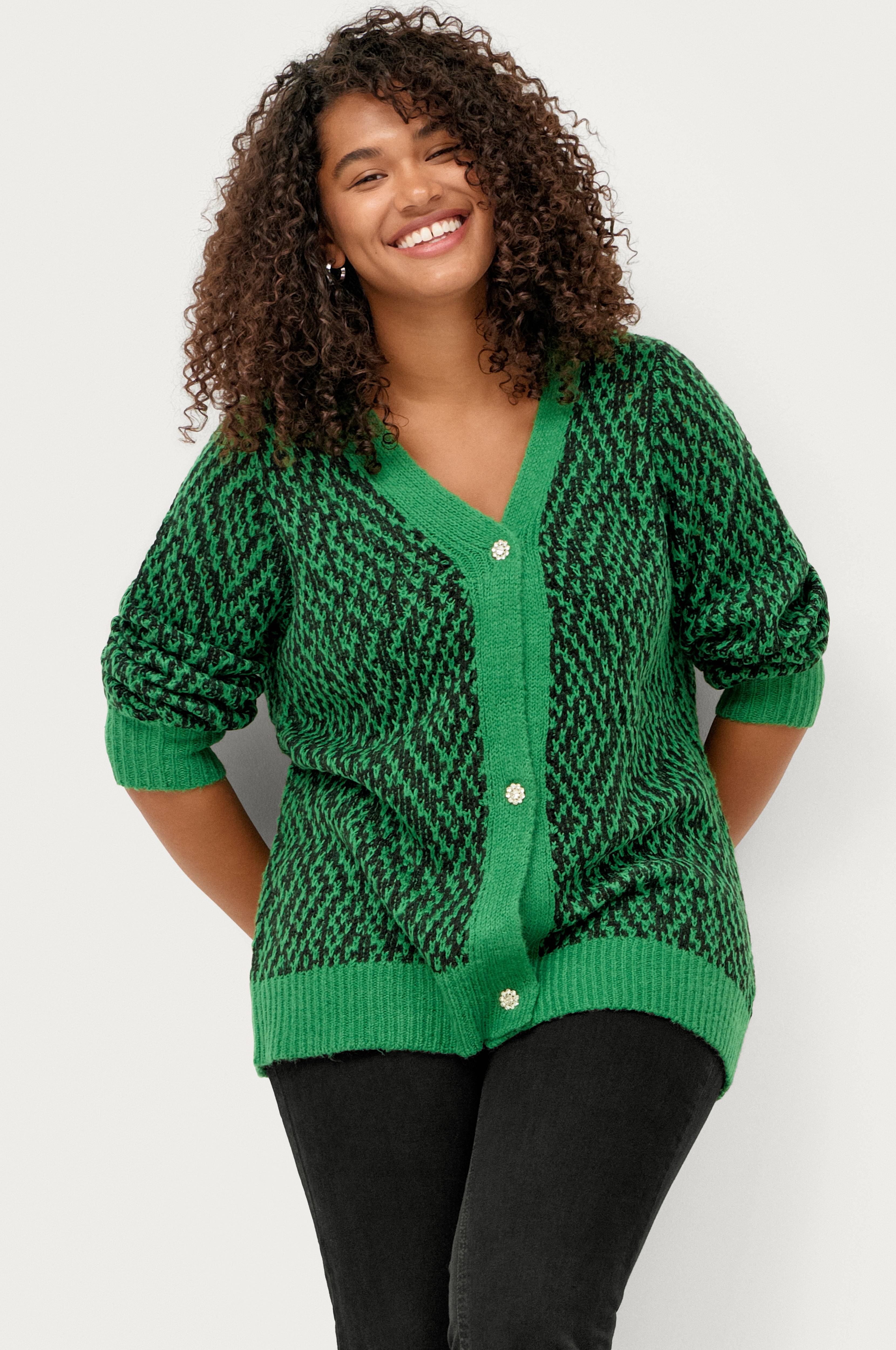 • Plusstørrelser• V-hals snitt• Knapper med strass foran• Myk, strikket kvalitet