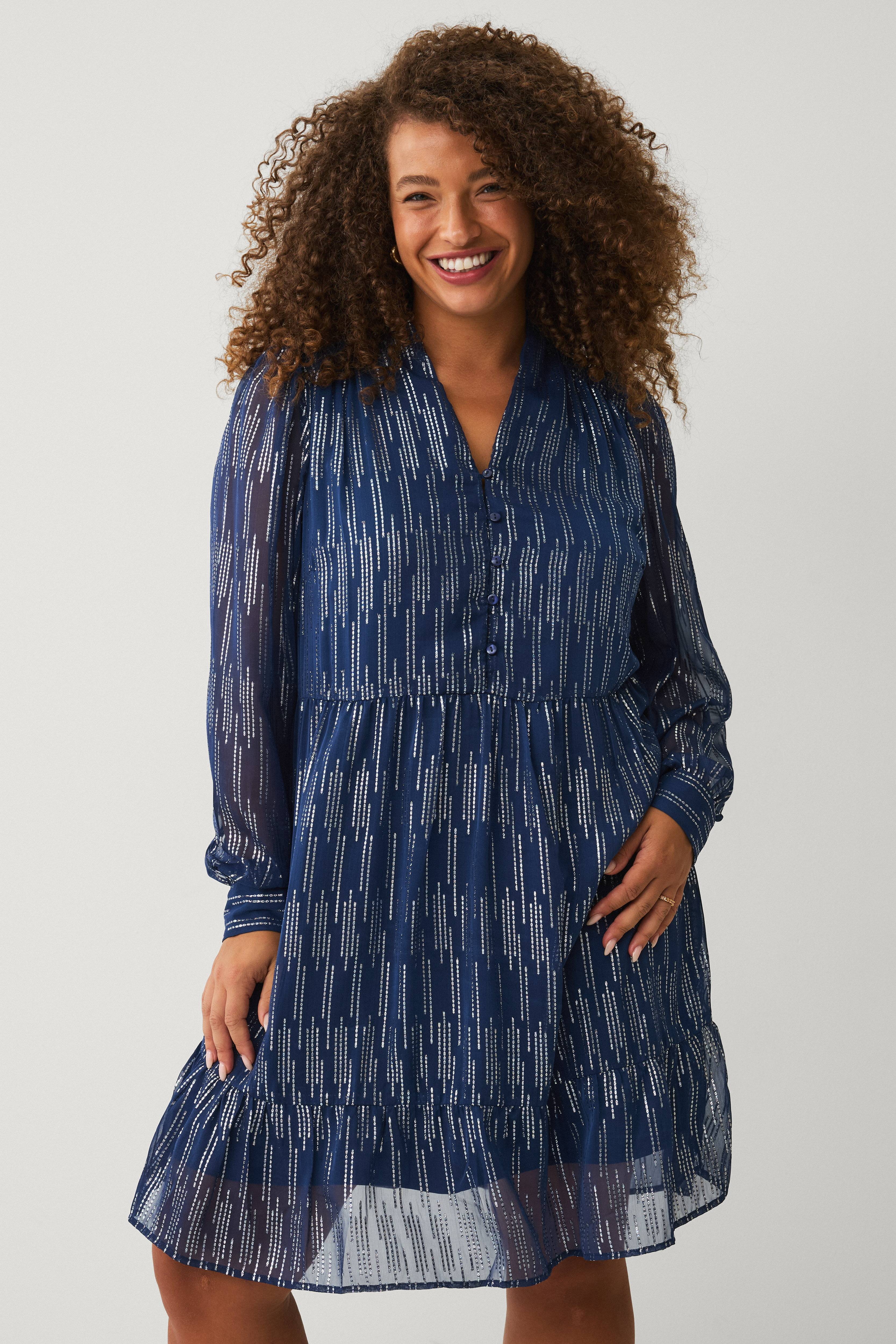 • Kjole med skinnende detaljer• V-hals• Lange, semitransparente puffermer• Mansjetter i ermeslutten• Kort frontknepping• Tekstilfôr• Utskjæring ved midjen• Volang i nedre kant• Pluss-størrelser• Lengde: 101 cm i størrelse S