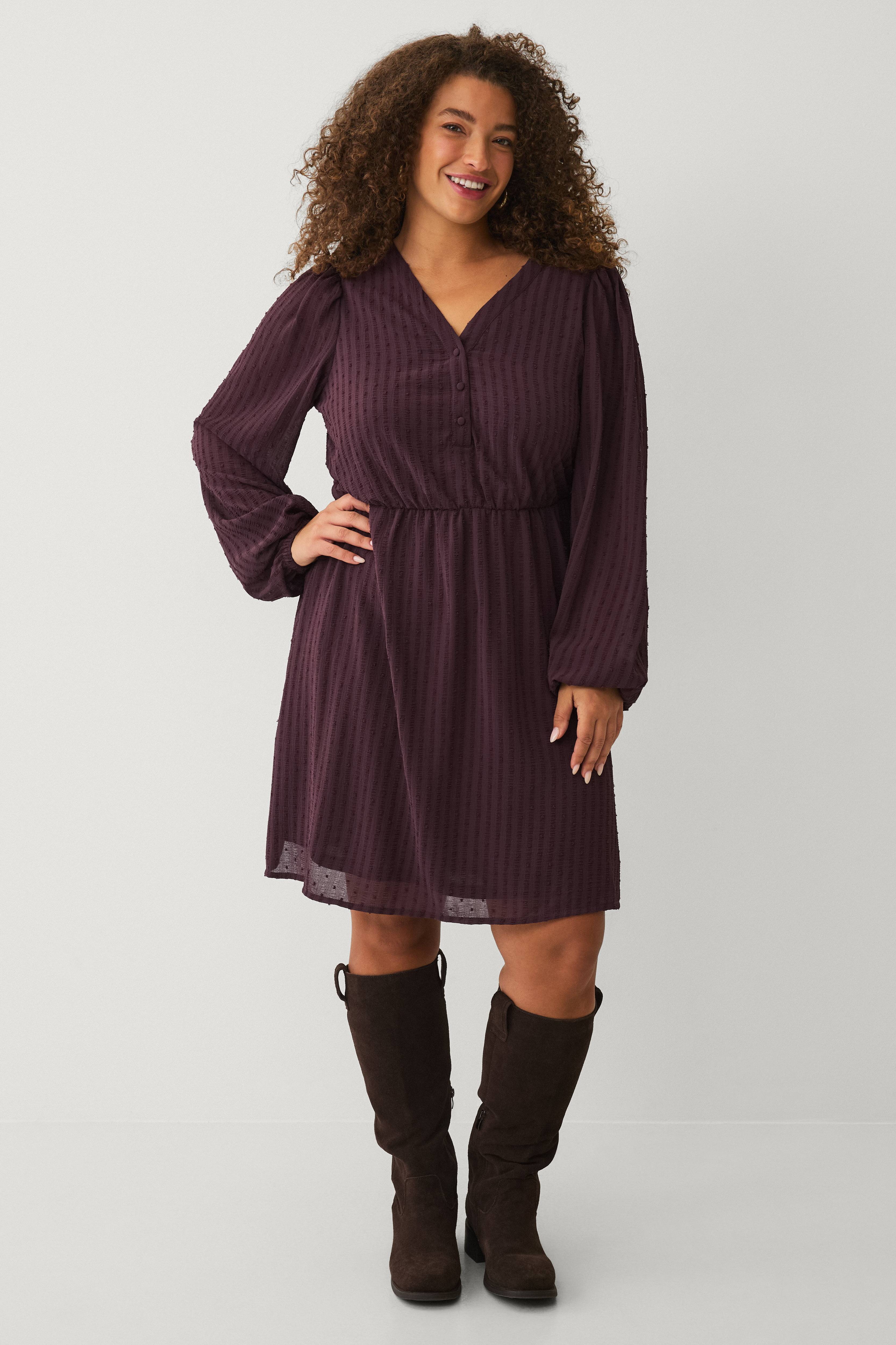 • Tynn kjole med struktur• V-formet hals med kort frontknepping• Definert, elastisk midje• Lange, halvtransparente ermer med gummistrikk i ermeslutten• Fôret• Lengde: 94 cm i størrelse S• Pluss-størrelser