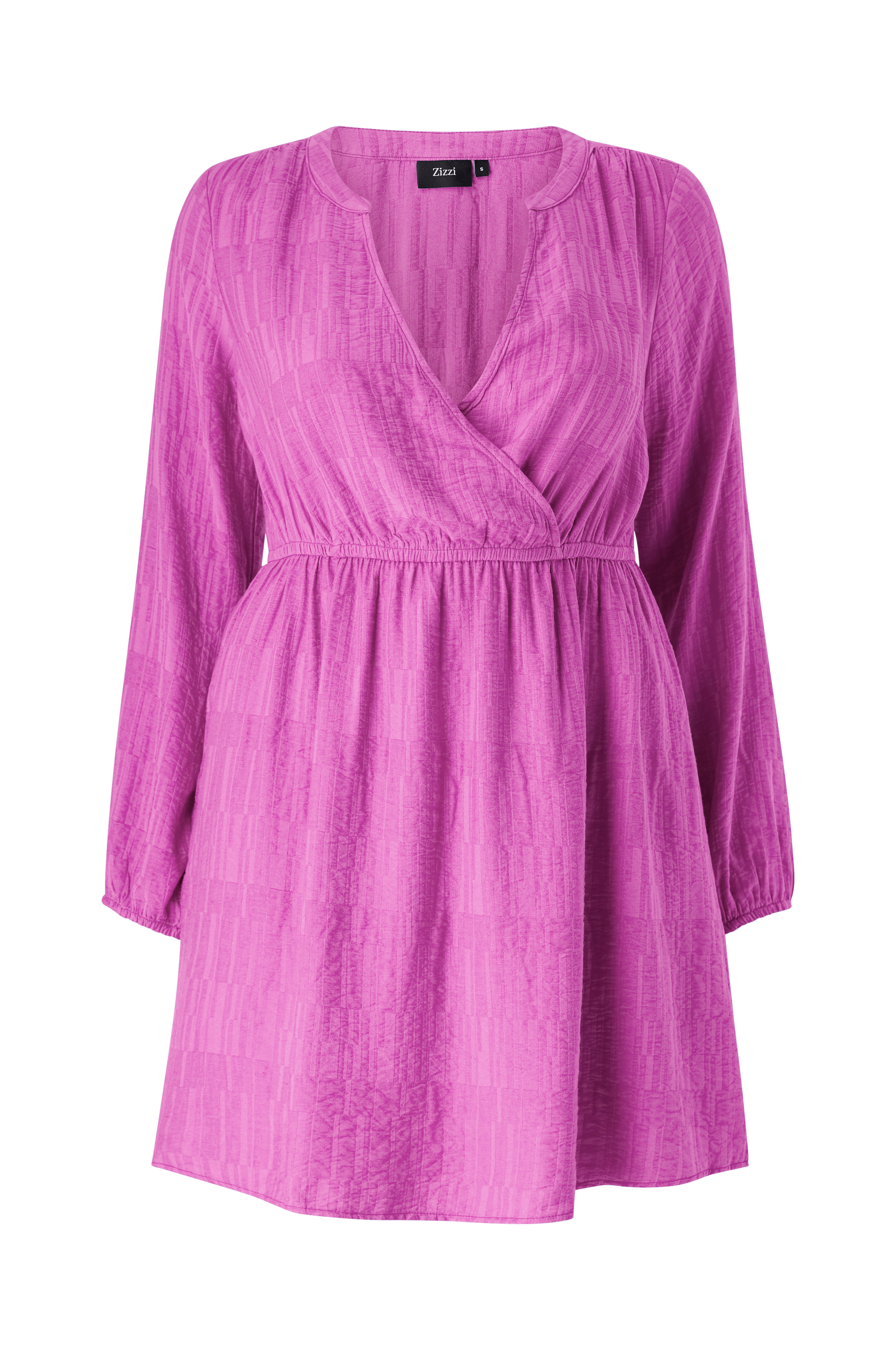 • Strukturmønstret kjole i viskosemiks• V-hals snitt med omslagsdesign• Rysje på skuldrene• Langt erme med gummistrikk i ermeslutten• Gummistrikk med rysje ved midjen• Utsvingt skjørt• Lengde: 93 cm i størrelse S• Pluss-størrelser