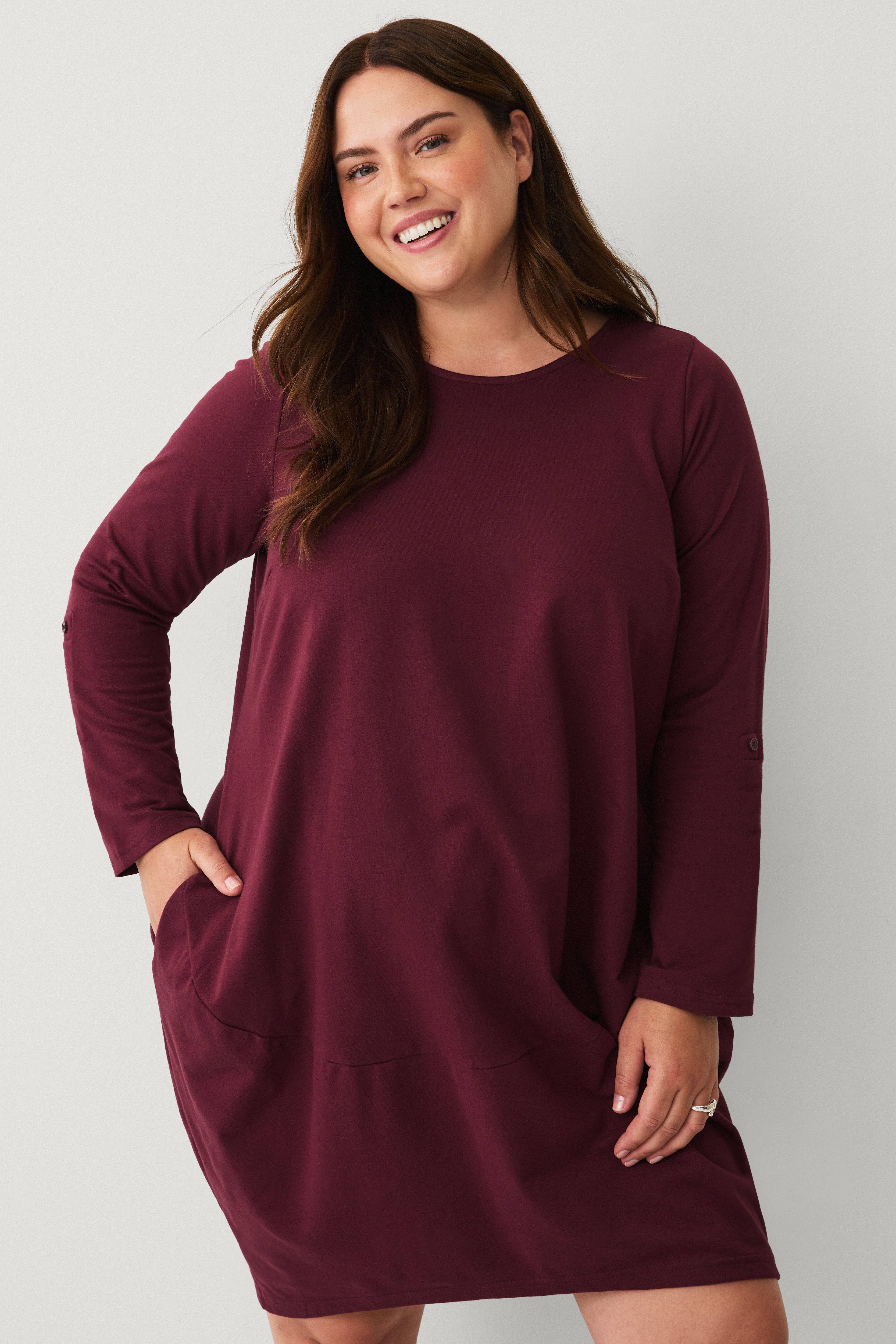 • Plusstørrelse• Uformell modell i jerseystoff• Rund hals• Langt, rett erme med innvendig hemp• Innfelte sidelommer• Bred, påsydd kant på bunnen• Lengde: 103 cm i størrelse S
