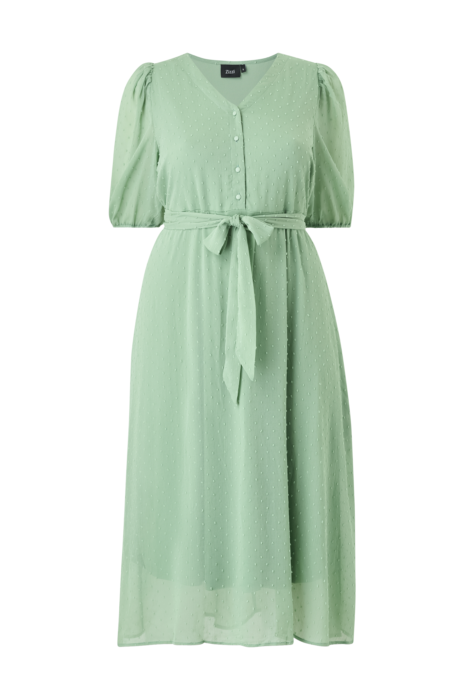 • Fôret kjole i chiffon• V-hals• Korte, gjennomsiktige ballongermer• Kort frontknepping• Knytebånd ved midjen• Pluss-størrelser• Lengde: 128 cm i størrelse S