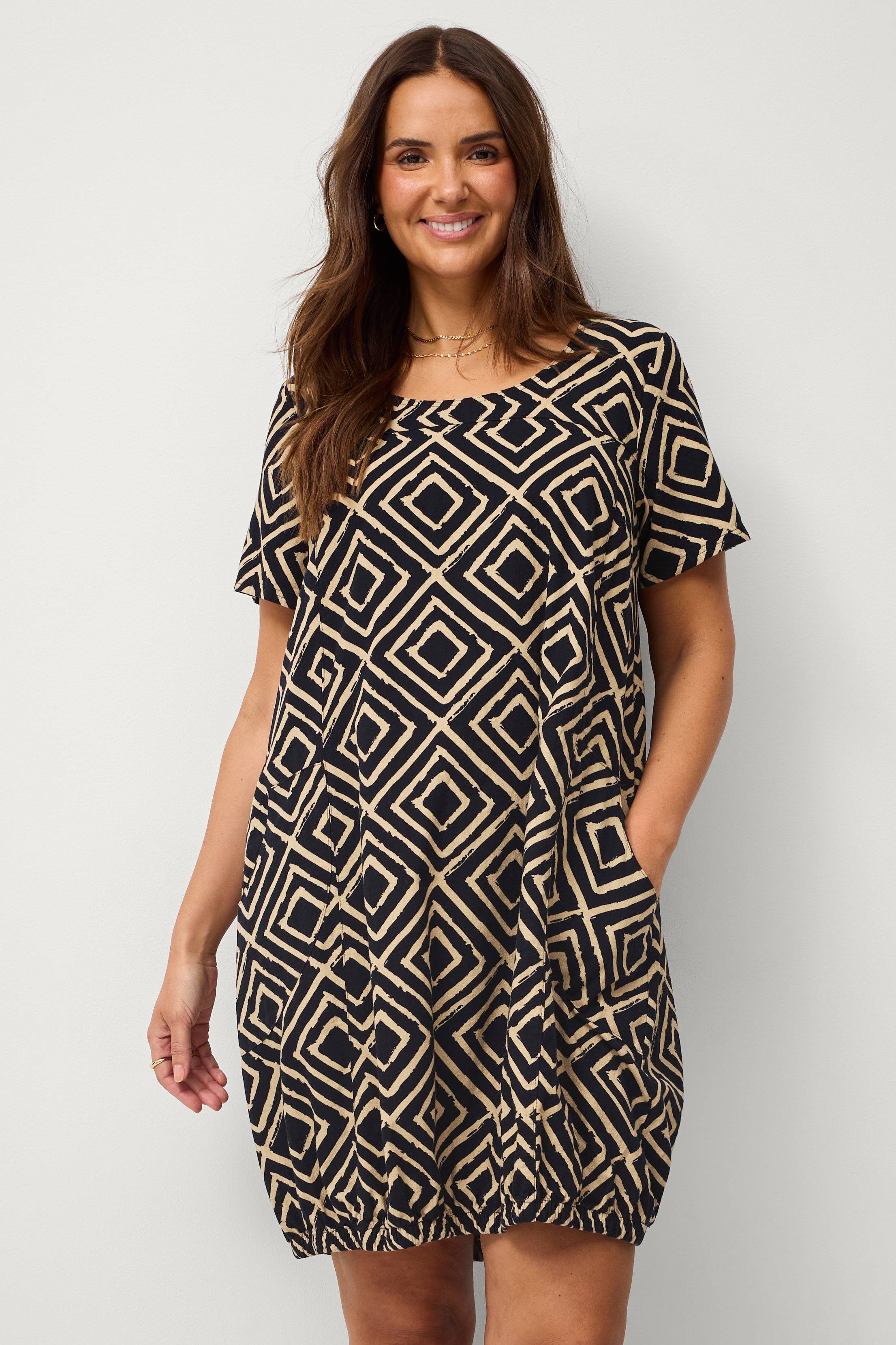 Kortermet kjole i vevd bomullskvalitet med mønster. Lommer foran og elastisk nederkant. Lengde ca. 95 cm i str S.