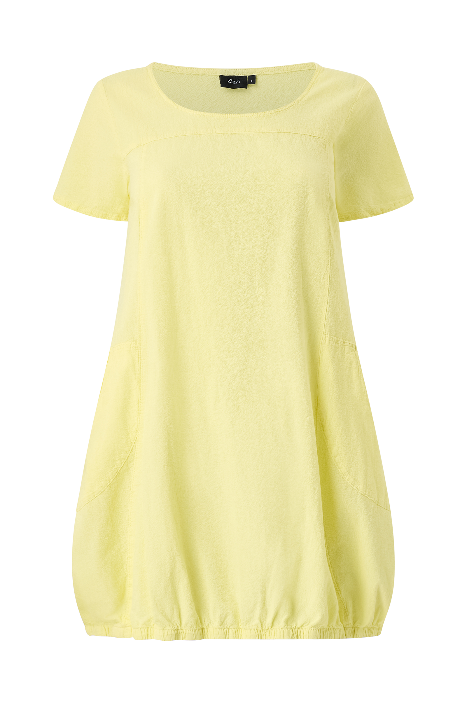 Behagelig bomullskjole med vevd struktur. Strikk nederst gir en mykt avrundet silhuett. Rund hals, korte ermer og lomme i sidene. Lengde ca. 96 cm i str S.