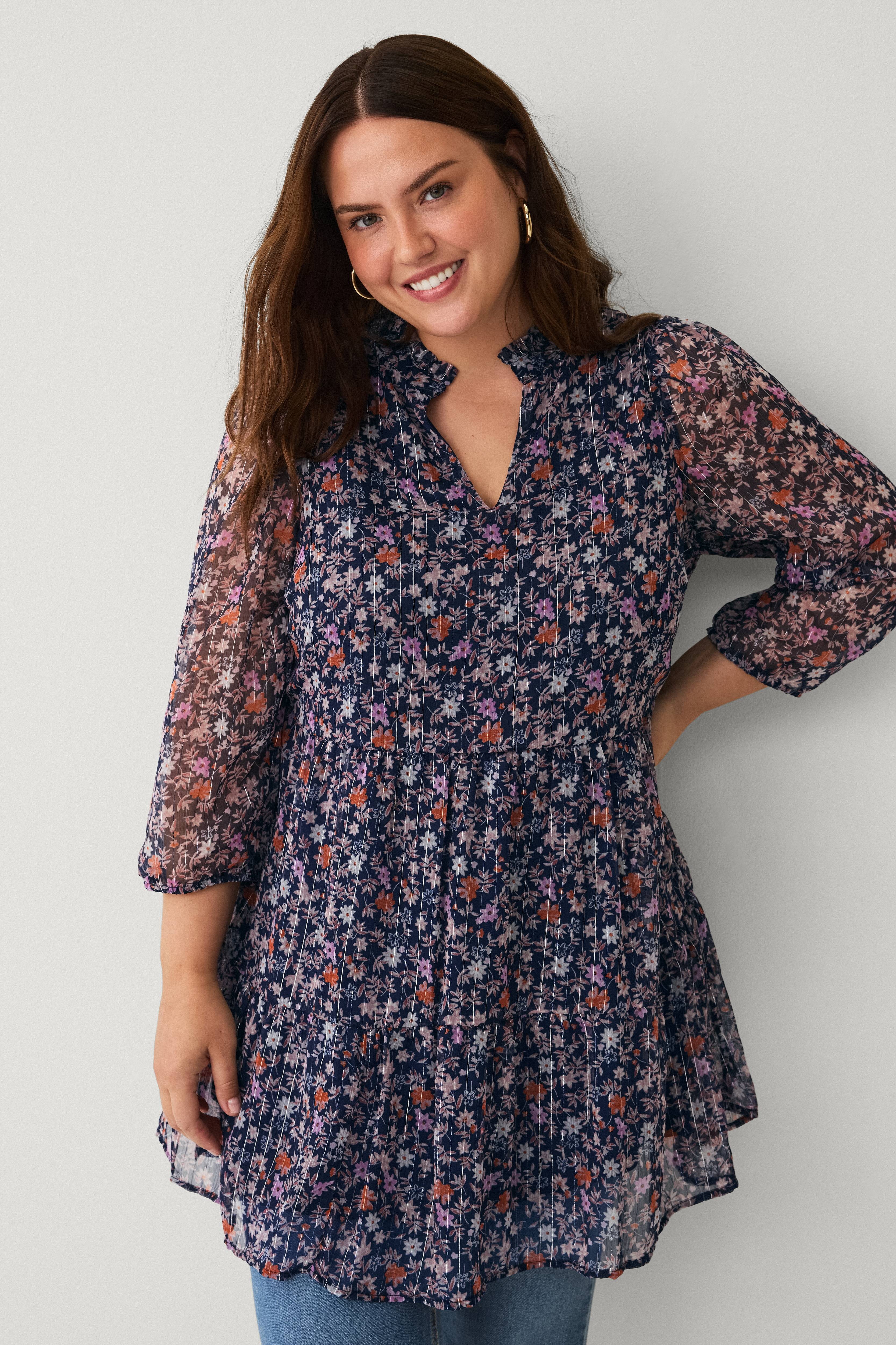 • Kort kjole i chiffon med et blomstermønster og glittertråd • Innsidefôr i chiffon • Rund hals med volangkrage og skjær • Puffermer 3/4 lang med gummistrikk i ermeslutten • Utskjæring ved midjen • Volang på bunnen • Pluss-størrelser • Lengde: 90 cm i størrelse S