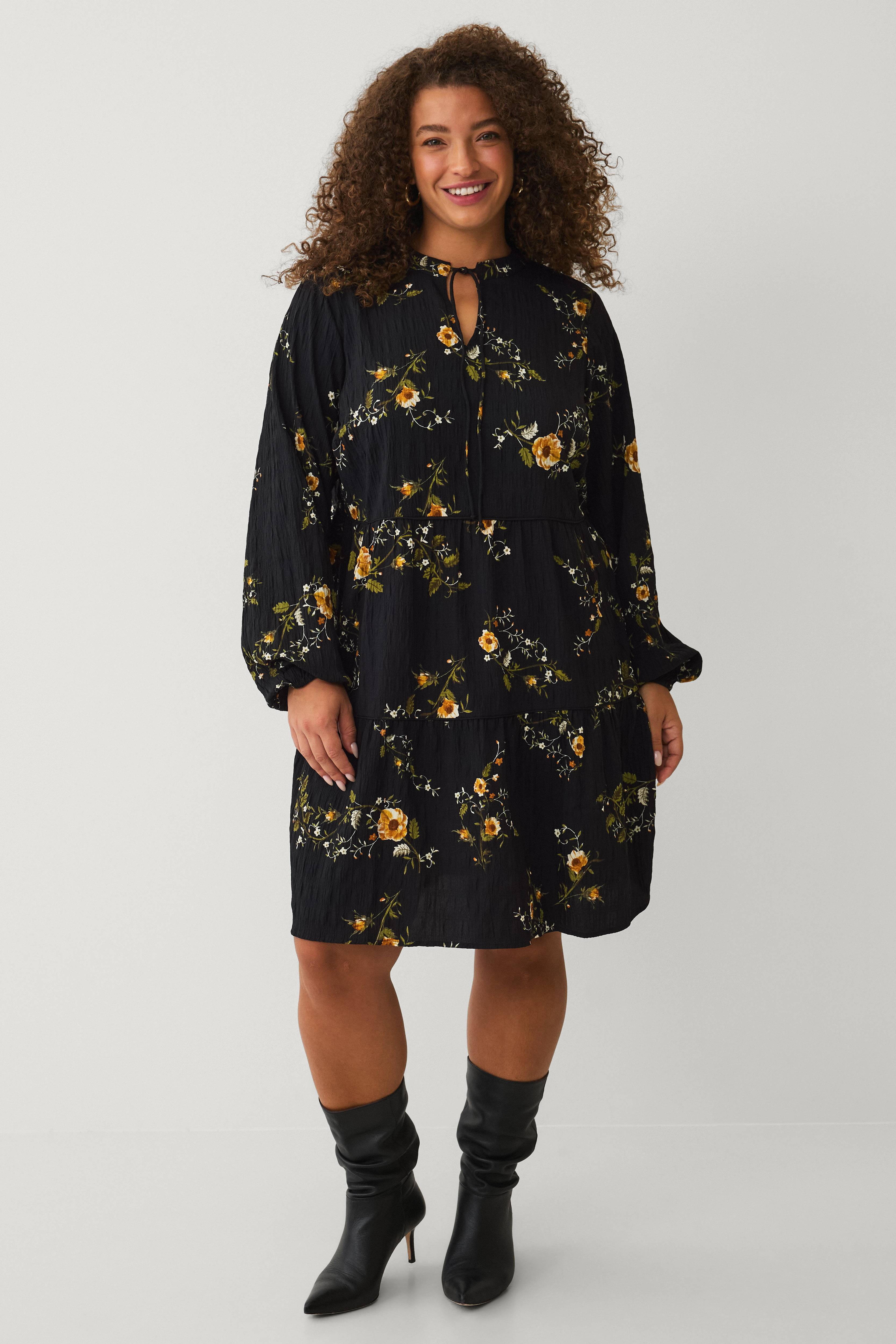 • Plusstørrelser• Utsvingt modell i krepp• Rund hals med ventilasjon og tynne knytbare tråder foran• Markert midje• Skjørt med volanger• Lengde: 96 cm i størrelse XS