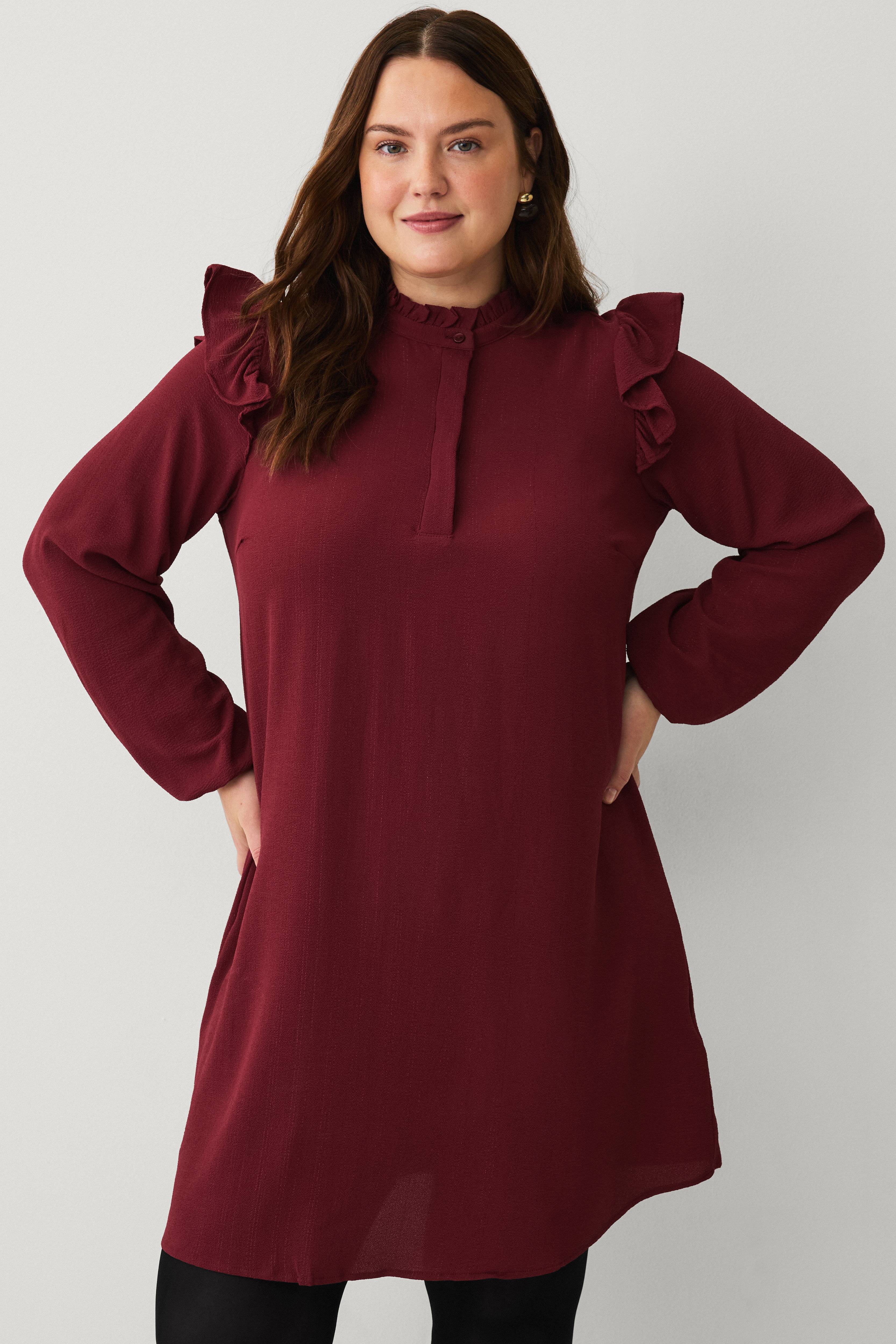 • Kjole med glitrende, tynne striper• Rund hals med skjult knappstolpe• Volangdetaljer rundt halsen og rundt skuldrene• Langt erme med gummistrikk i ermeslutten• Plusstørrelser• Lengde: 95 cm i størrelse S
