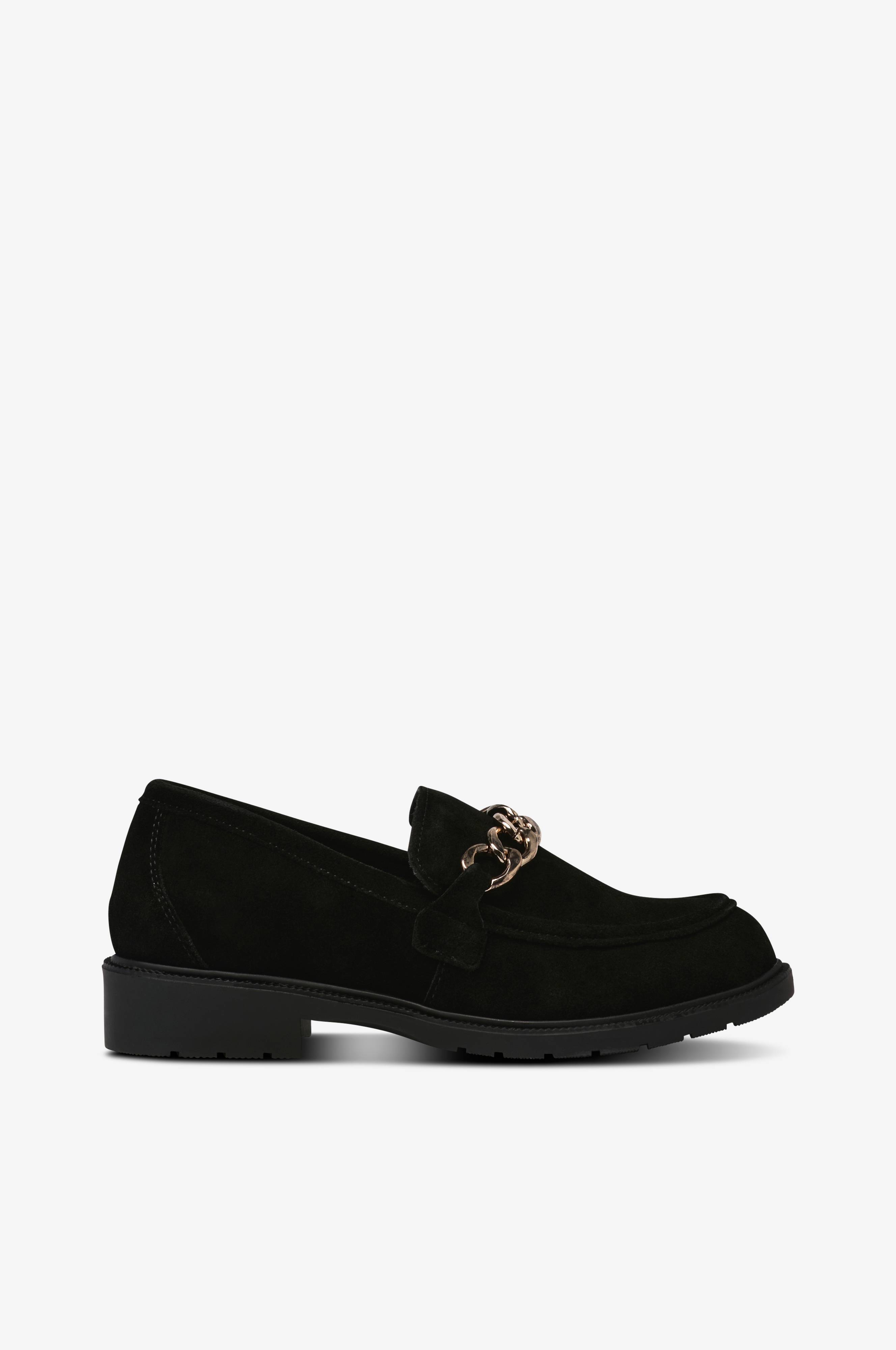 - Ekstra bred passform- Overdel i semsket skinn- Dekorativ lenke i metall over foten- Bred passform- Yttersåle i gummi- Skoene kan oppleves som store i størrelse. Velg gjerne en størrelse mindre når du bestiller.