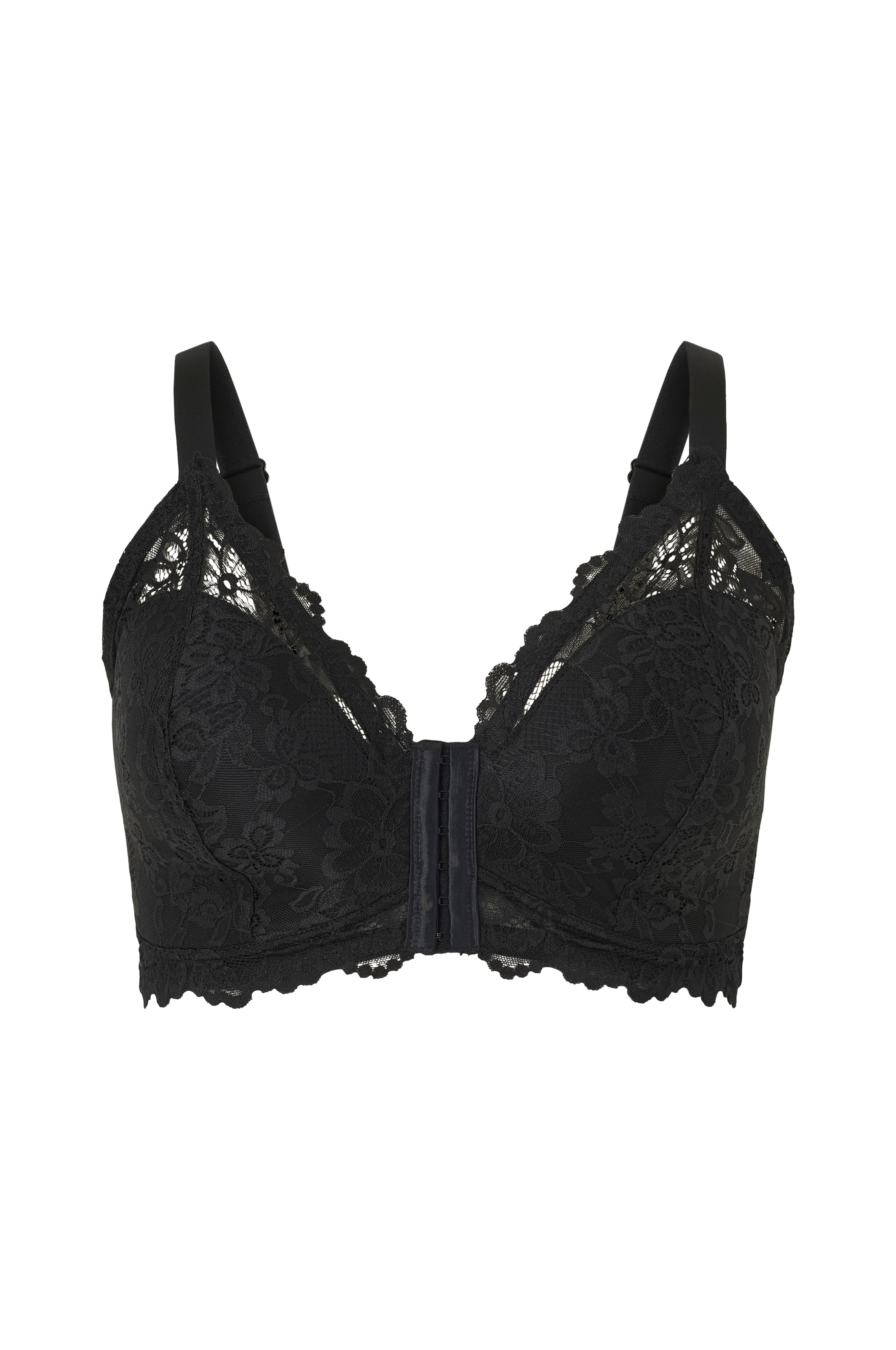 • Formpressede kopper med tynn polstring• Blondekant• Lukking med hekte og malje foran• Jersey i ryggen• Justerbare skulderstropper• Plusstørrelser