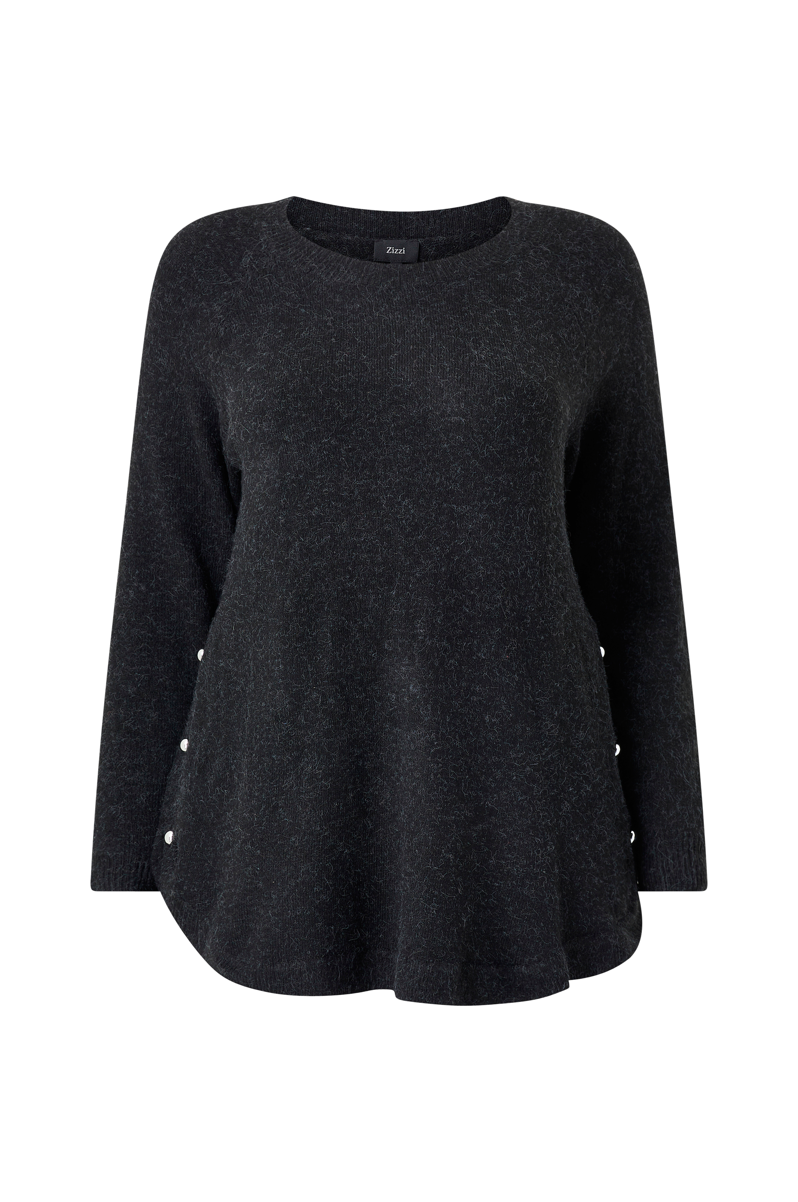 • Myk, finstrikket pullover• Rund, ribbet hals• Lange raglanermer med ribbet mansjetter• Avrundet hem med ribbestrikk• Splitt med dekorative knapper nede i sidene• Pluss-størrelser