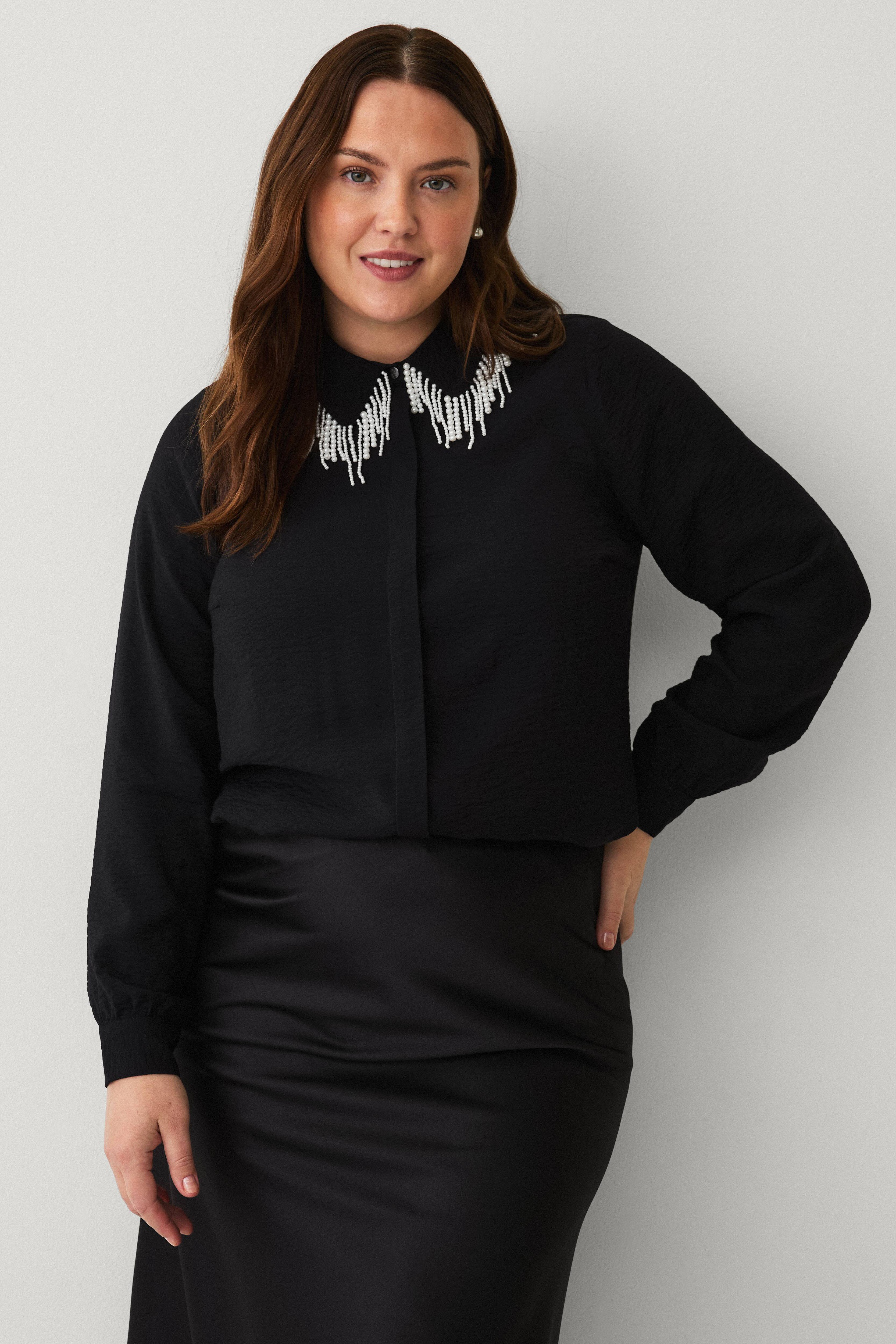 • Langermet skjorte i rynket materiale med skjult frontknepping• Krage med dekorative, hengte perler• Avrundet hem med litt lengre bakside• Pluss-størrelser
