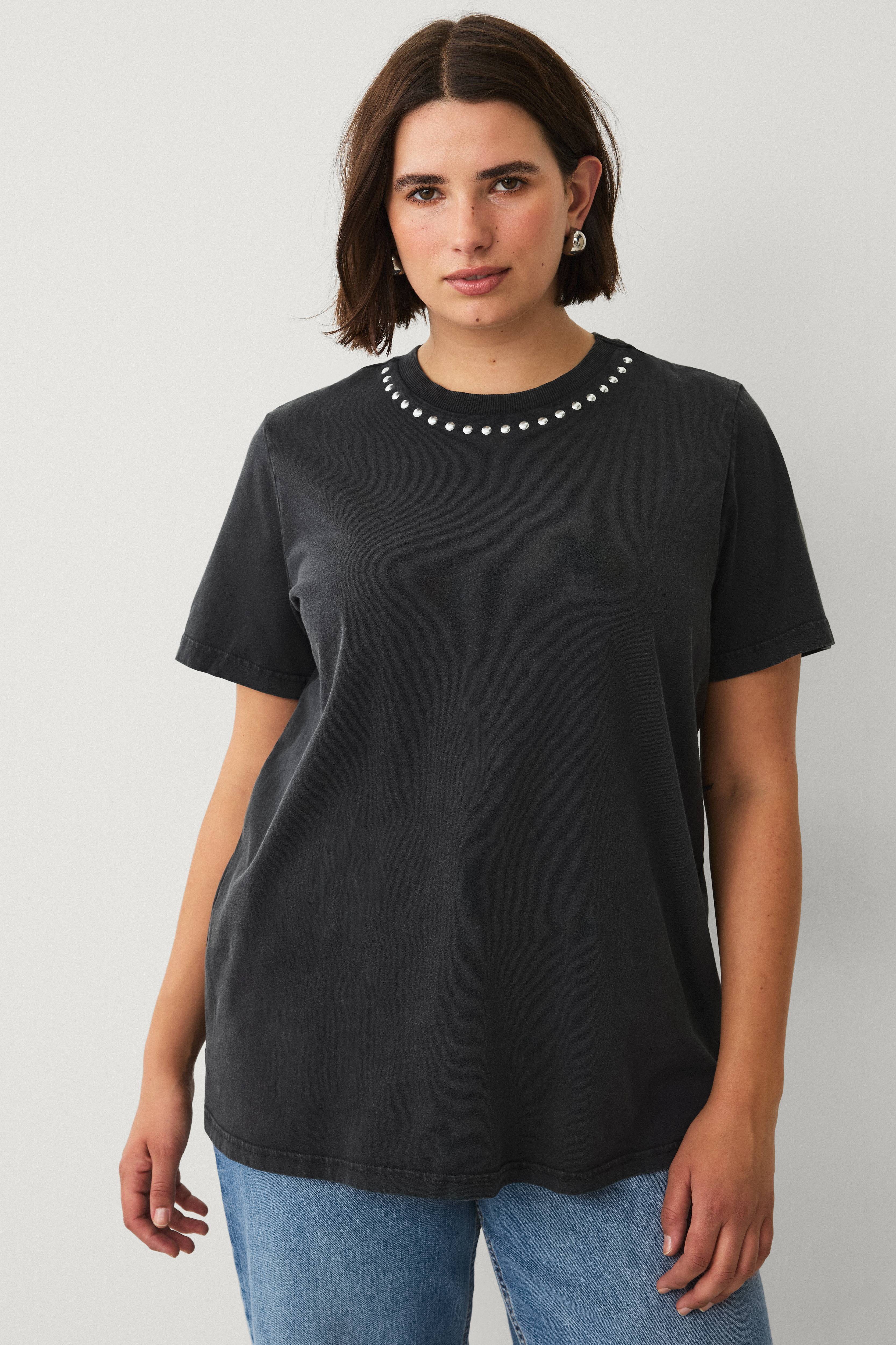 • Myk, stretchy t-skjorte i bomull• Rund, ribbet hals med runde stifter foran• Pluss-størrelser