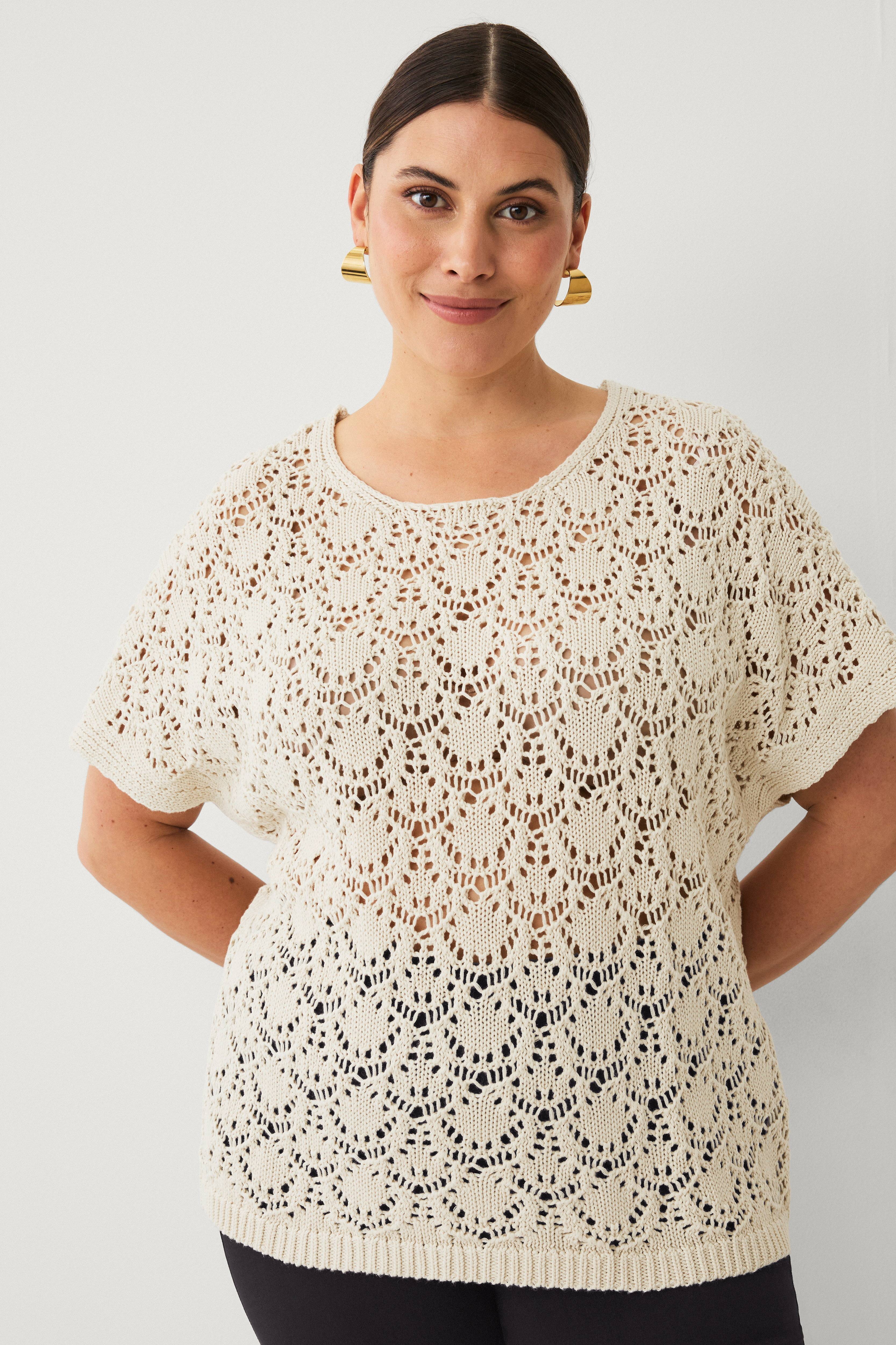 • Plusstørrelser• Rett, mønsterstrikket modell• Rund hals• Utringet skulder• Ribbestrikk i nedre kant