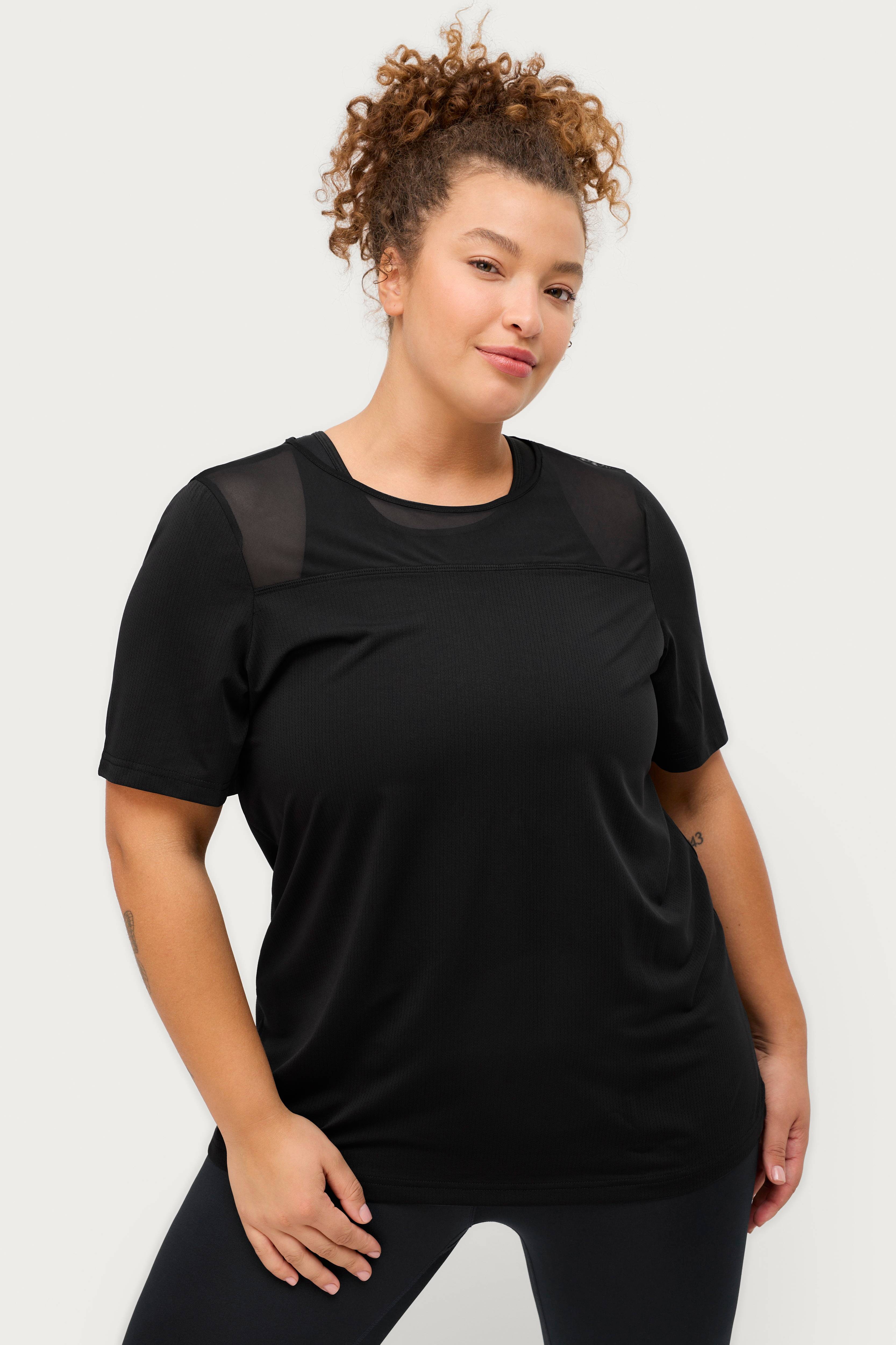 • Luftig topp i perforert tricot• Gjennomsiktig mesh oppover ryggen• Korte ermer• Plusstørrelser
