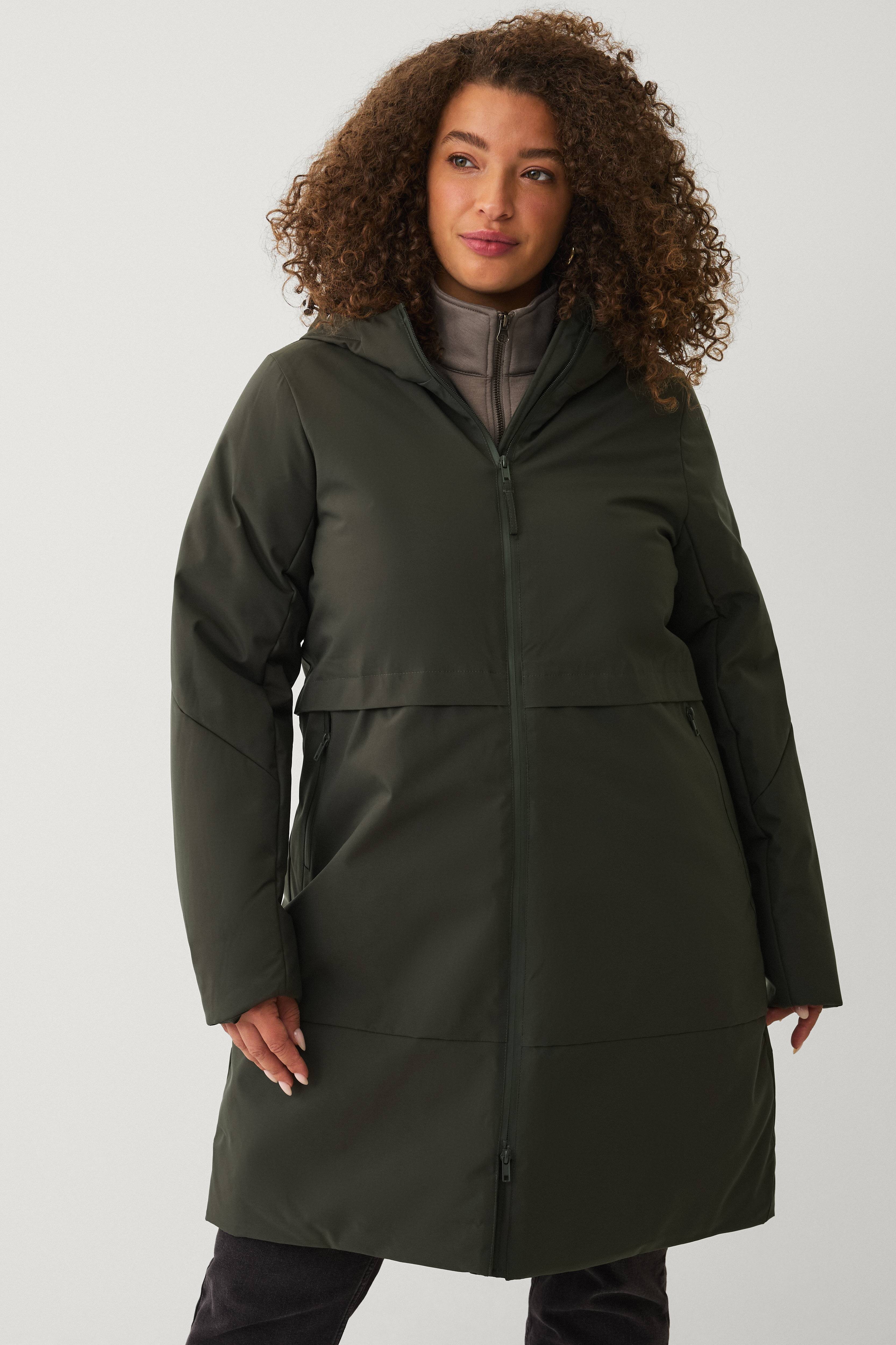• Varm, vindtett og vannavvisende vinterjakke med en lett og feminin A-form. • Fast, justerbar hette • Vanntett to-veis glidelås • Snøring ved midjen • To lommer med glidelås • Plusstørrelser • Vannsøyle: 8000 mm • Lengde: 101 cm i størrelse S