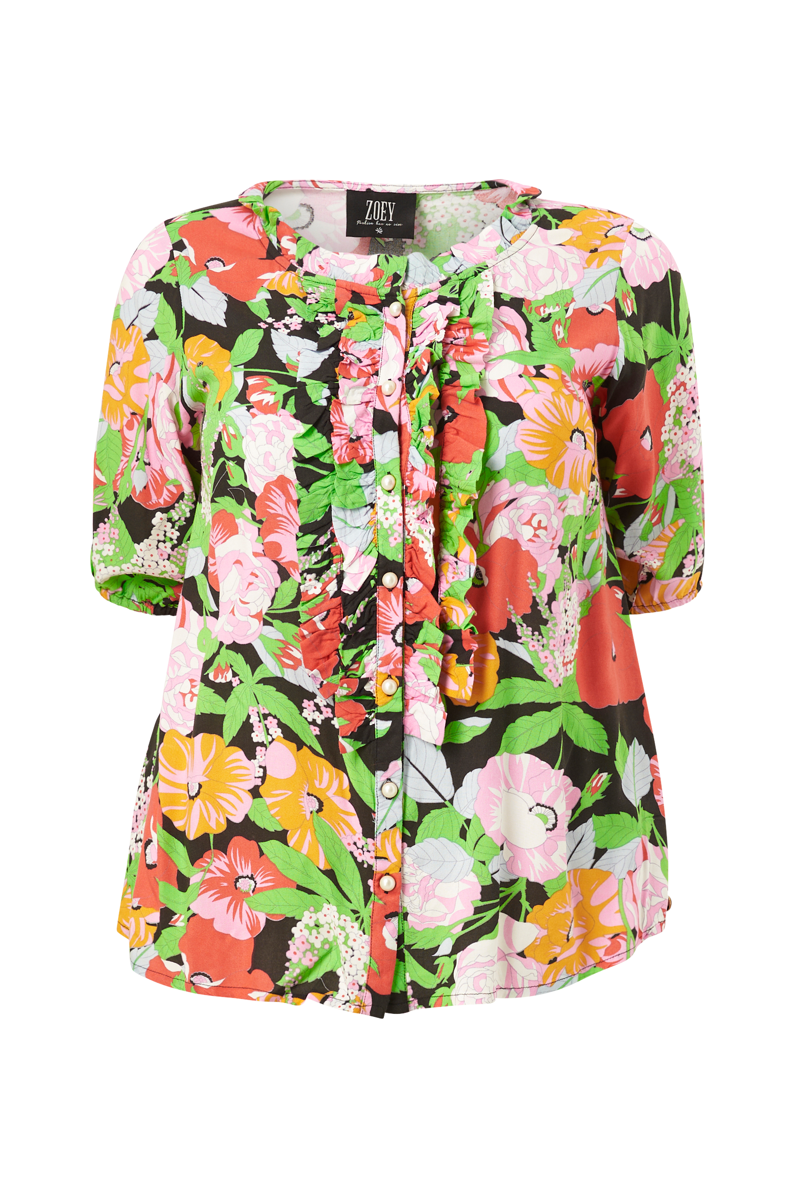 • Mønstret bluse i viskose• Rysje foran• Knapper foran• Korte ermer• Volang i halsen• Plusstørrelser