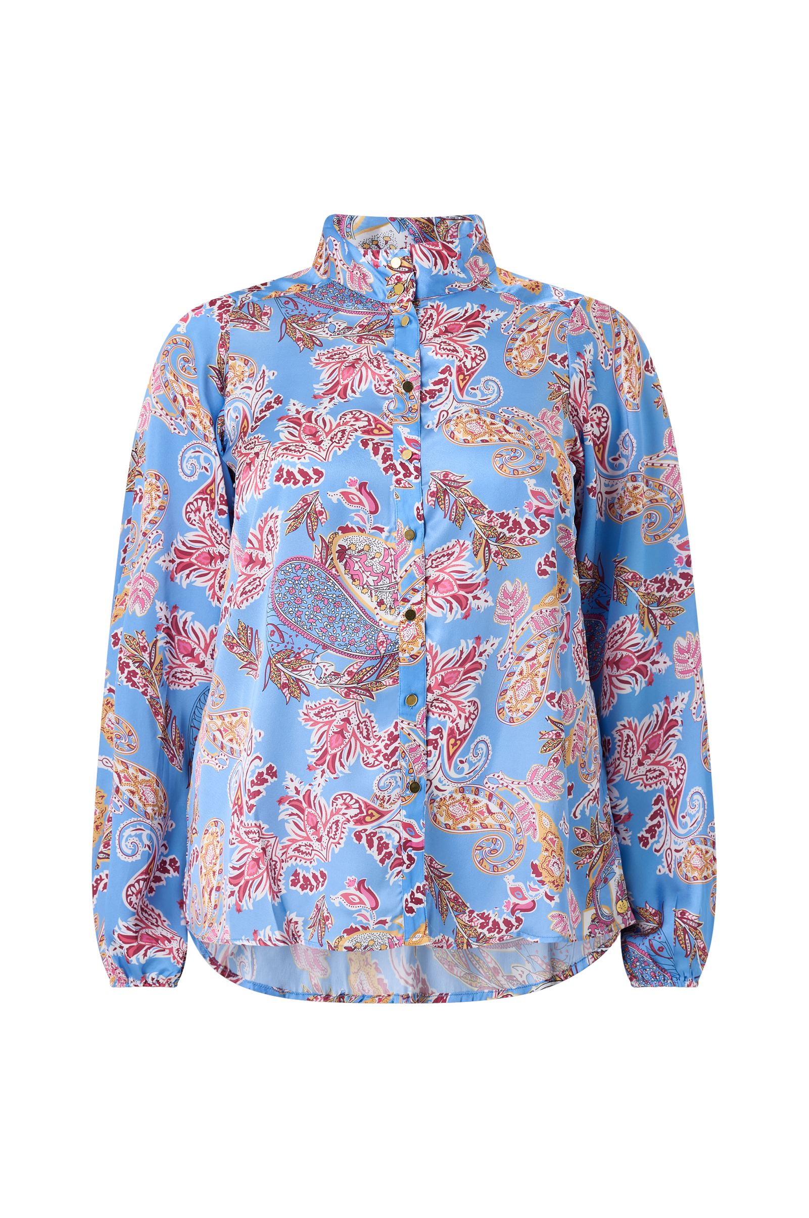 • Satengbluse med et paisleymønster og høy krage• Knappelukking• Lange ermer med elastiske ermeender• Litt lengre, avrundet bakside• Pluss-størrelser