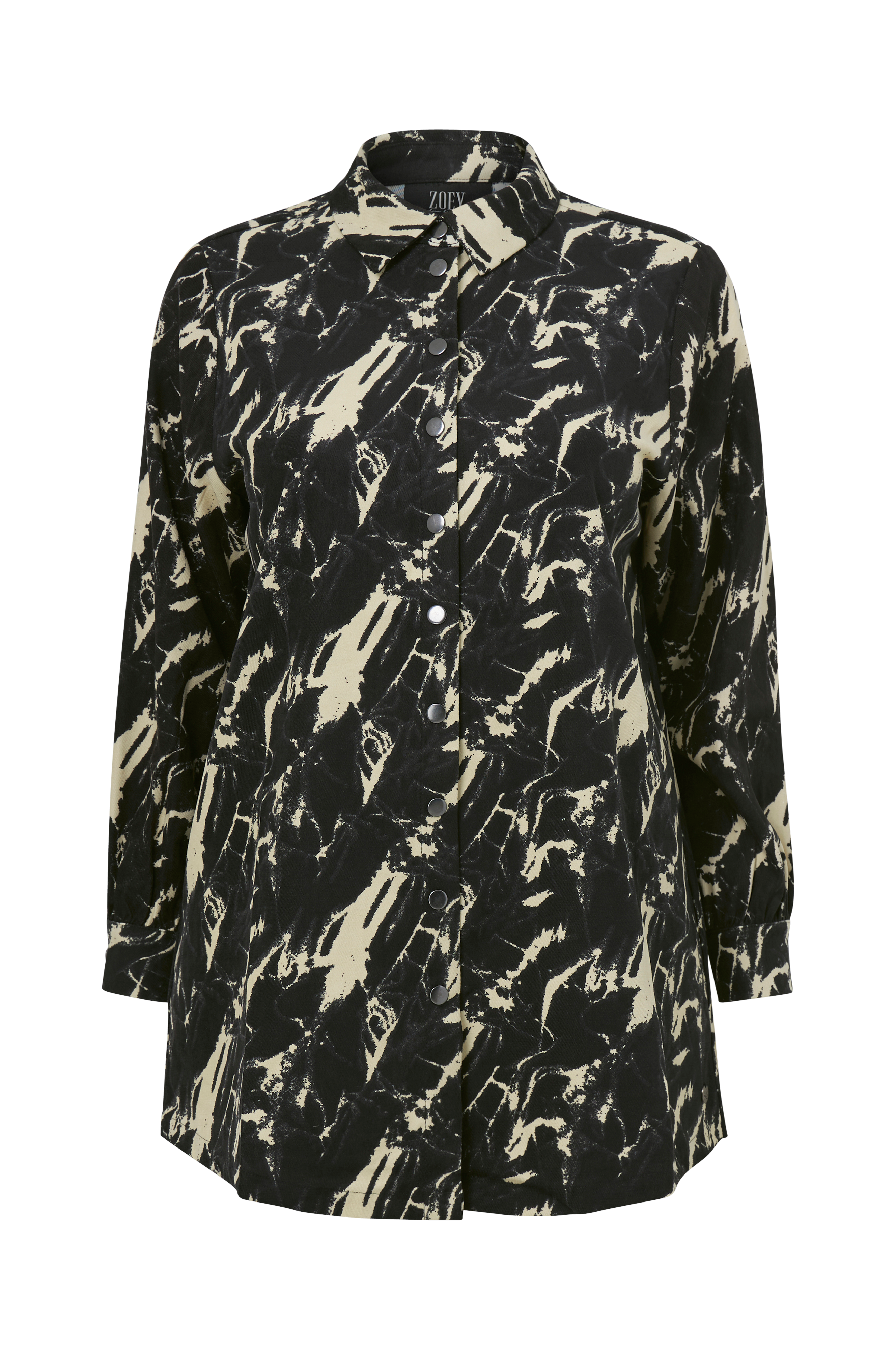 Skjorte i litt lenger modell i myk, kordfløyelslignende kvalitet. Trykknapper foran og lange, vide ermer med mansjett.