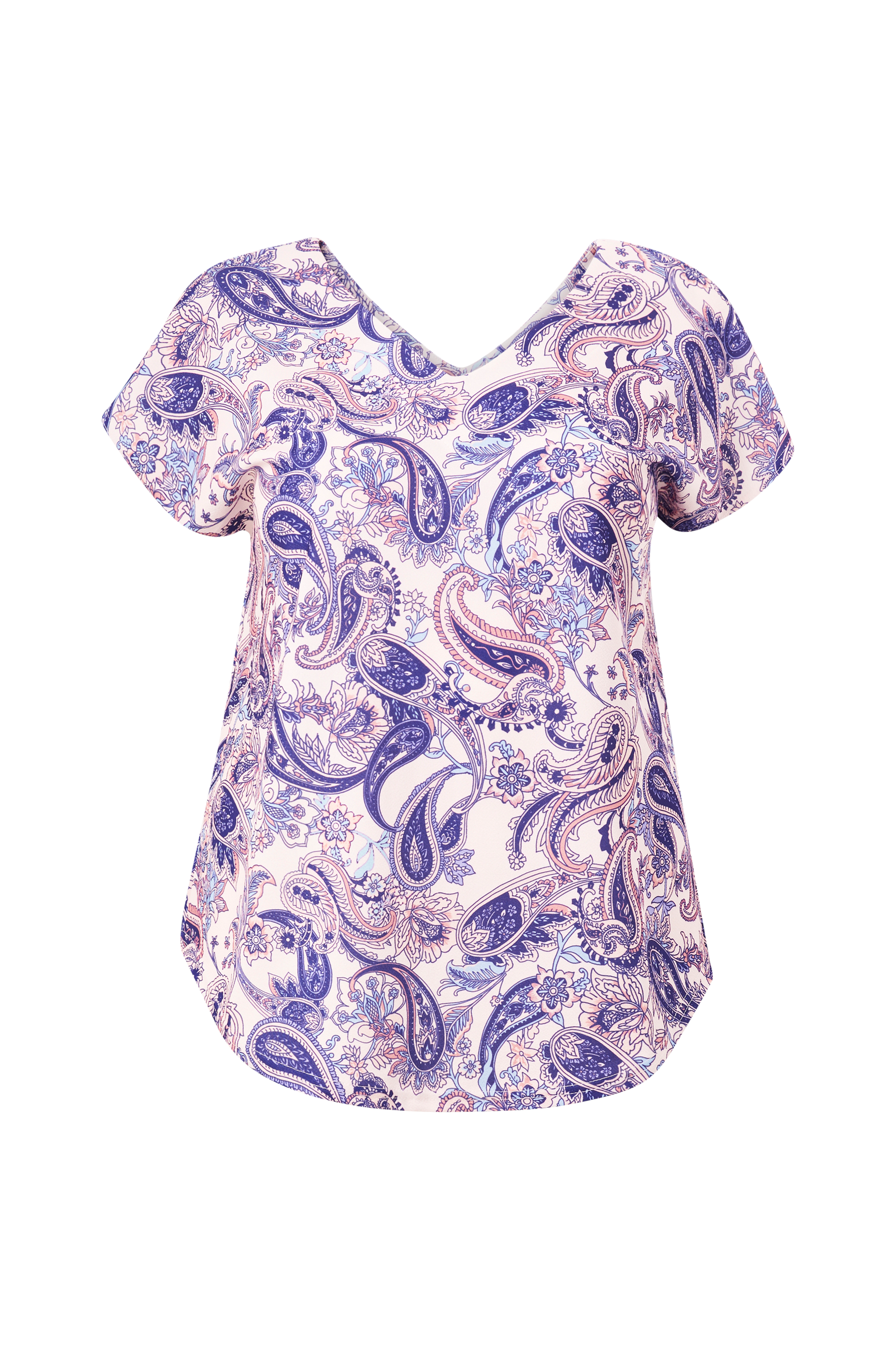 • Korte ermer• V-hals snitt foran og bakpå• Avrundet hem• Plusstørrelser