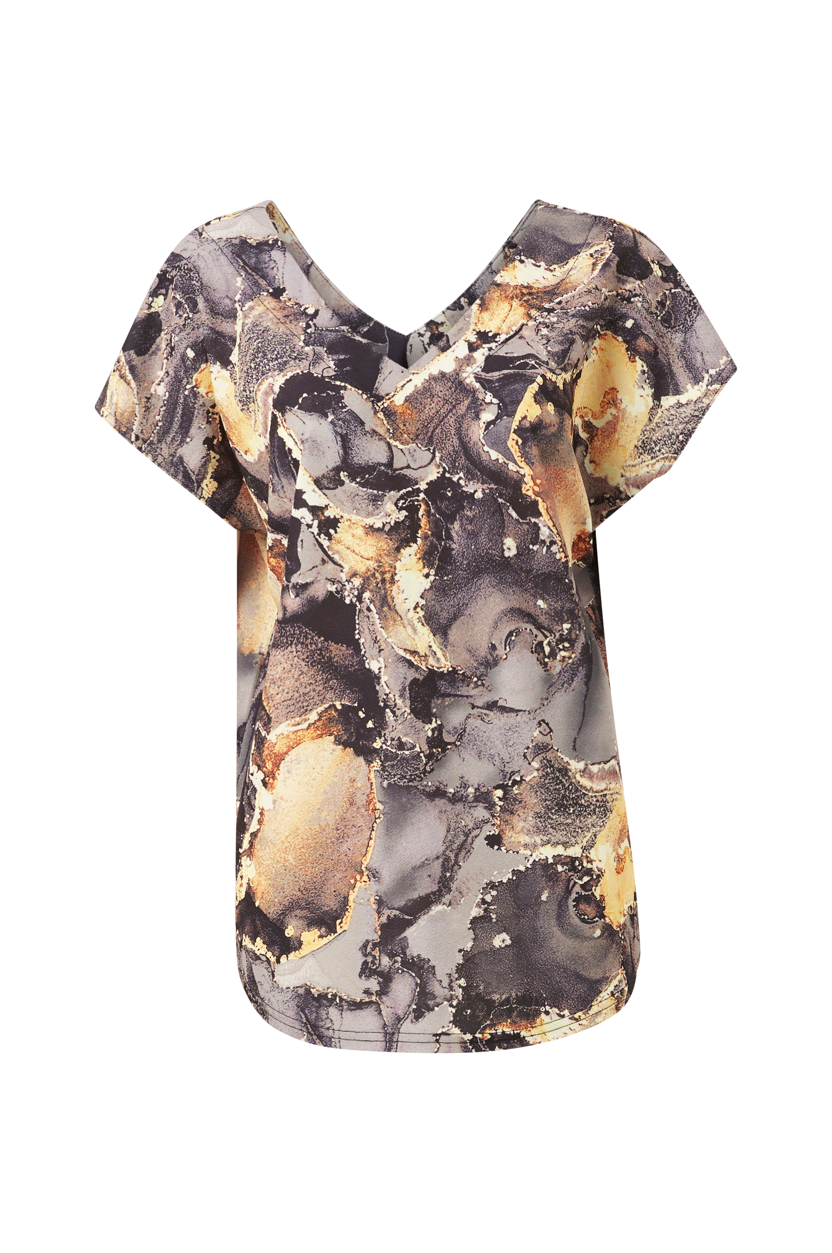 • Plusstørrelser• Rett modell i jerseystoff• V-hals snitt i halsen og i nakken• Utringet skulder med kort erme• Avrundet hem